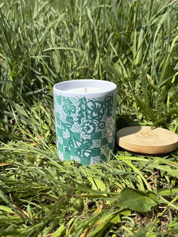 La bougie Vichy vert est un hommage au motif vichy, revisité avec une touche florale, à la manière de la porcelaine d’époque. Son parfum Feuilles de figue s’accorde délicatement avec son décor et diffuse ses notes vertes et légèrement fruitées d’une figue encore verte qui commence à mûrir.